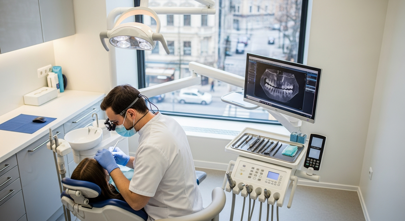 | عيادة أسنان عامة (مثال في أوروبا الشرقية) | فحوصات دورية، علاج قناة الجذر | 150 - 800 يورو |