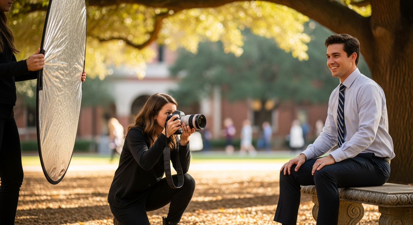 Die Wahl der Kleidung hat einen erheblichen Einfluss auf dein gesamtes Erscheinungsbild auf den Abschlussfotos. Klassische Optionen umfassen Anzüge, Kleider oder elegante Kombinationen aus Rock/Hose und Bluse/Hemd. Achte auf gut sitzende Kleidung, die weder zu eng noch zu weit ist. Neutrale Farben wie Marineblau, Grau, Schwarz oder Creme wirken oft zeitlos und elegant, während kräftigere Farben wie Smaragdgrün oder Burgunderrot einen schönen Kontrast bilden können, ohne zu dominant zu sein. Vermeide Muster, die zu unruhig sind oder zu sehr von deinem Gesicht ablenken. Auch der Stoff spielt eine Rolle: Knitterarme Materialien sind vorteilhaft, um während des Shootings ein gepflegtes Erscheinungsbild zu bewahren. Komfort ist ebenfalls entscheidend, da du dich in deiner Kleidung frei bewegen und entspannen können solltest, um natürliche Posen einzunehmen.