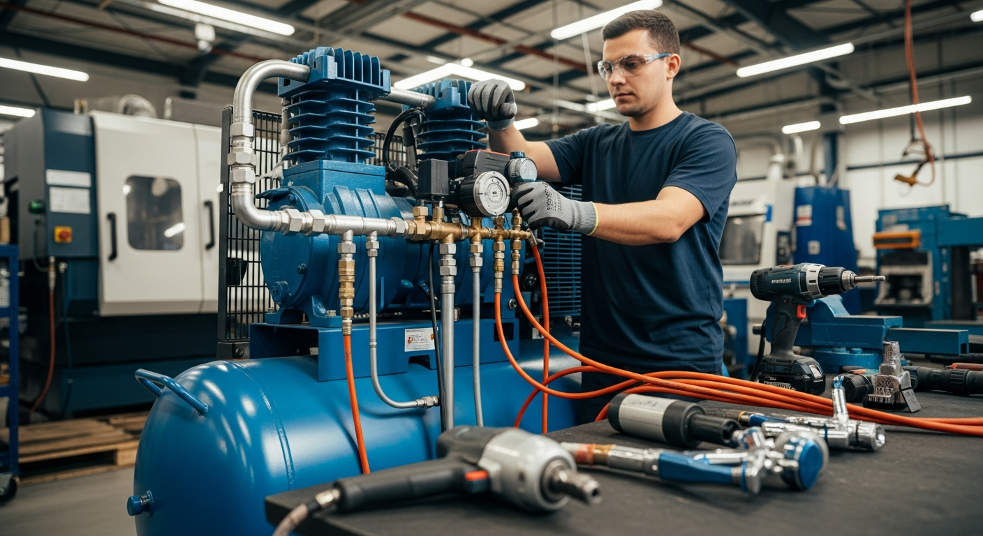 Ο συμπιεστής αέρα είναι μια μηχανή που μετατρέπει την ενέργεια (συνήθως από ηλεκτροκινητήρα, πετρελαιοκινητήρα ή βενζινοκινητήρα) σε κινητική ενέργεια αποθηκευμένη σε πεπιεσμένο αέρα. Αυτός ο αέρας, όταν απελευθερώνεται, μπορεί να χρησιμοποιηθεί για την τροφοδοσία διαφόρων πνευματικών εργαλείων και μηχανημάτων. Η βασική αρχή λειτουργίας περιλαμβάνει την αναρρόφηση ατμοσφαιρικού αέρα, τη συμπίεσή του σε μικρότερο όγκο και την αποθήκευσή του σε μια δεξαμενή υπό πίεση. Οι δύο πιο κοινοί τύποι συμπιεστών είναι οι παλινδρομικοί (με έμβολο) και οι κοχλιοφόροι (με κοχλίες). Οι παλινδρομικοί συμπιεστές είναι συχνά πιο κατάλληλοι για διαλείπουσα χρήση, ενώ οι κοχλιοφόροι προτιμώνται για συνεχή λειτουργία σε βιομηχανικές εφαρμογές.