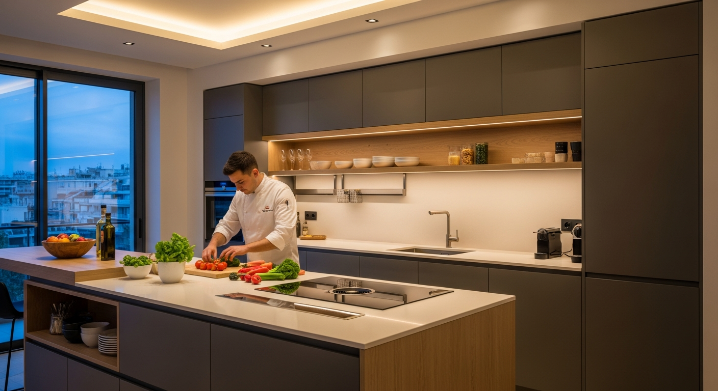 Οι σύγχρονες τάσεις στον σχεδιασμό κουζίνας εστιάζουν στην απλότητα, την καθαρότητα των γραμμών και την απρόσκοπτη ενσωμάτωση της τεχνολογίας, δημιουργώντας χώρους που είναι ταυτόχρονα κομψοί και εξαιρετικά λειτουργικοί. Ανοιχτοί χώροι που συνδέονται αρμονικά με το σαλόνι ή την τραπεζαρία είναι ιδιαίτερα δημοφιλείς, καθώς δημιουργούν μια αίσθηση ευρυχωρίας, φωτεινότητας και κοινωνικότητας, επιτρέποντας την αλληλεπίδραση κατά τη διάρκεια της προετοιμασίας του φαγητού. Τα ουδέτερα χρώματα, όπως το γκρι, το λευκό και το μπεζ, παραμένουν στην πρώτη γραμμή των επιλογών, συχνά σε συνδυασμό με φυσικές ξύλινες υφές ή μεταλλικές λεπτομέρειες για να προσθέσουν ζεστασιά, βάθος και χαρακτήρα. Η χρήση έξυπνων συσκευών, ο κρυφός φωτισμός LED που αναδεικνύει την αρχιτεκτονική και οι επιφάνειες εργασίας από υλικά όπως ο χαλαζίας, ο γρανίτης ή το Corian, προσφέρουν όχι μόνο αισθητική αναβάθμιση αλλά και αυξημένη λειτουργικότητα, αντοχή στην καθημερινή φθορά και ευκολία συντήρησης.