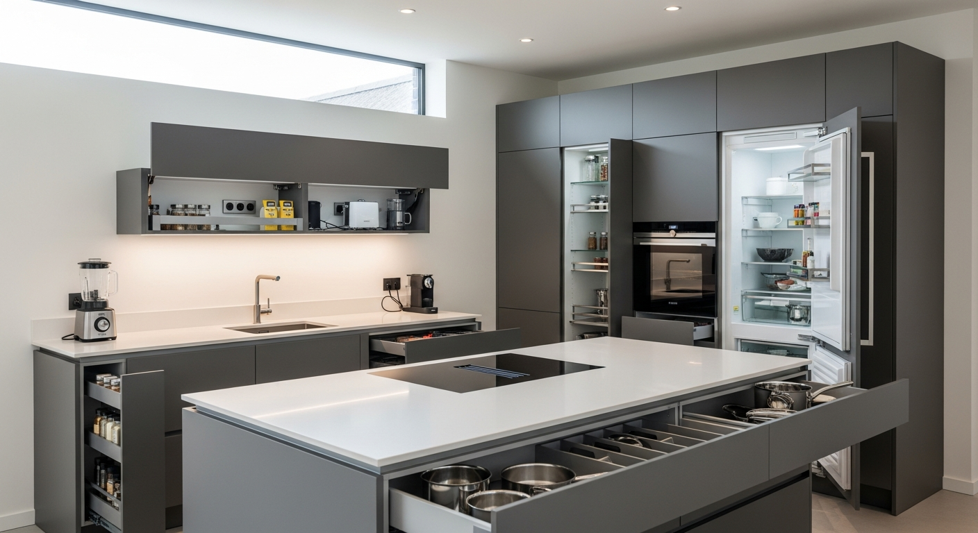 Ενσωματωμένες λύσεις αποθήκευσης σε μοντέρνες κουζίνες.