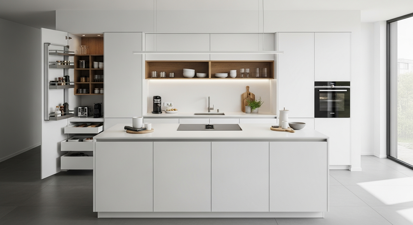 Ο σχεδιασμός είναι η καρδιά κάθε ιταλικής κουζίνας. Ακόμη και σε οικονομικές κουζίνες, μπορούν να ενσωματωθούν βασικά στοιχεία που αναδεικνύουν το ιταλικό στυλ. Αυτά περιλαμβάνουν καθαρές γραμμές, μινιμαλιστικές λαβές ή συστήματα ανοίγματος χωρίς λαβές, καθώς και μια ισορροπημένη παλέτα χρωμάτων που συχνά περιλαμβάνει ουδέτερους τόνους, όπως λευκό, γκρι και μπεζ, συμπληρωμένους με φυσικά υλικά όπως ξύλο. Η έμφαση στην πρακτικότητα και την ευκολία χρήσης είναι επίσης χαρακτηριστικό. Η ενσωμάτωση έξυπνων λύσεων αποθήκευσης, όπως συρτάρια πλήρους επέκτασης και μηχανισμοί γωνιακών ντουλαπιών, μπορεί να προσδώσει λειτουργικότητα υψηλής ποιότητας χωρίς την ανάγκη για υπερβολικά περίπλοκα και ακριβά προσαρμοσμένα στοιχεία. Η επιλογή ανοιχτών ραφιών ή γυάλινων προσόψεων μπορεί να προσθέσει ελαφρότητα και στυλ, μειώνοντας παράλληλα το κόστος των κλειστών ντουλαπιών.