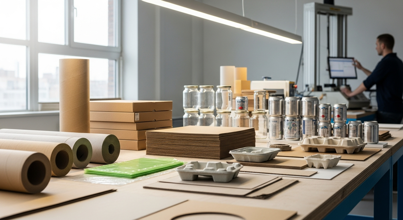 Το χαρτί και το χαρτόνι είναι ανανεώσιμα και βιοδιασπώμενα υλικά, δημοφιλή για κουτιά, σακούλες και προστατευτικά ένθετα. Το γυαλί προσφέρει εξαιρετική προστασία από οσμές και γεύσεις, είναι ανακυκλώσιμο και ιδανικό για τρόφιμα, ποτά και καλλυντικά. Τα μέταλλα, όπως το αλουμίνιο και ο χάλυβας, χρησιμοποιούνται για κονσέρβες και κουτιά, παρέχοντας υψηλή αντοχή και αποτελεσματική προστασία από το φως και τον αέρα.