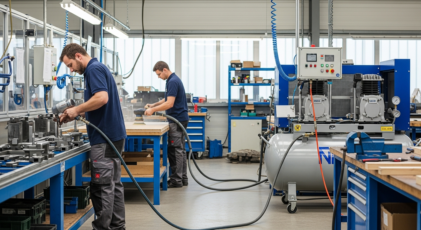 Στον βιομηχανικό τομέα, ο πεπιεσμένος αέρας αποτελεί μια ζωτικής σημασίας πηγή ενέργειας για την αυτοματοποίηση και τον έλεγχο διαδικασιών. Χρησιμοποιείται για την κίνηση πνευματικών κυλίνδρων σε γραμμές παραγωγής, για τη μεταφορά υλικών, για τον καθαρισμό επιφανειών και για τη λειτουργία ρομπότ. Σε εργαστήρια, ο πεπιεσμένος αέρας τροφοδοτεί εξοπλισμό δοκιμών, συστήματα κενού και όργανα ακριβείας, παρέχοντας ένα καθαρό και σταθερό μέσο λειτουργίας.