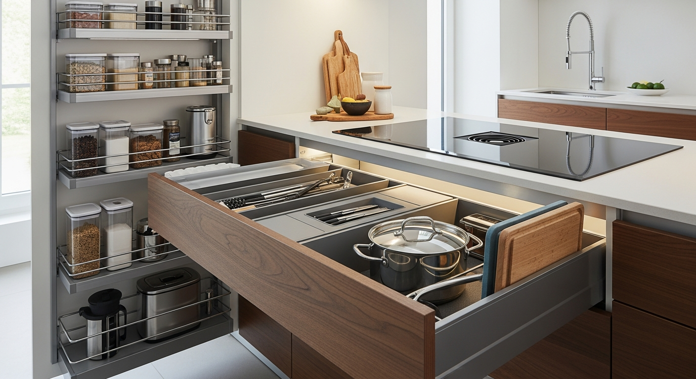 Η βελτιστοποίηση του χώρου σε κάθε κουζίνα, ανεξαρτήτως μεγέθους, είναι ζωτικής σημασίας για την καθημερινή λειτουργικότητα. Πρακτικές λύσεις περιλαμβάνουν την εγκατάσταση συρταριών με πλήρη επέκταση για εύκολη πρόσβαση στο περιεχόμενο, ειδικά συστήματα οργάνωσης για μαχαιροπίρουνα και σκεύη, καθώς και περιστρεφόμενα ράφια (le mans ή magic corner) για τα γωνιακά ντουλάπια. Επίσης, η χρήση κάθετης αποθήκευσης με ράφια μέχρι το ταβάνι ή συστήματα κρεμαστών ράβδων για εργαλεία και κατσαρόλες μπορεί να ελευθερώσει πολύτιμο χώρο στους πάγκους.