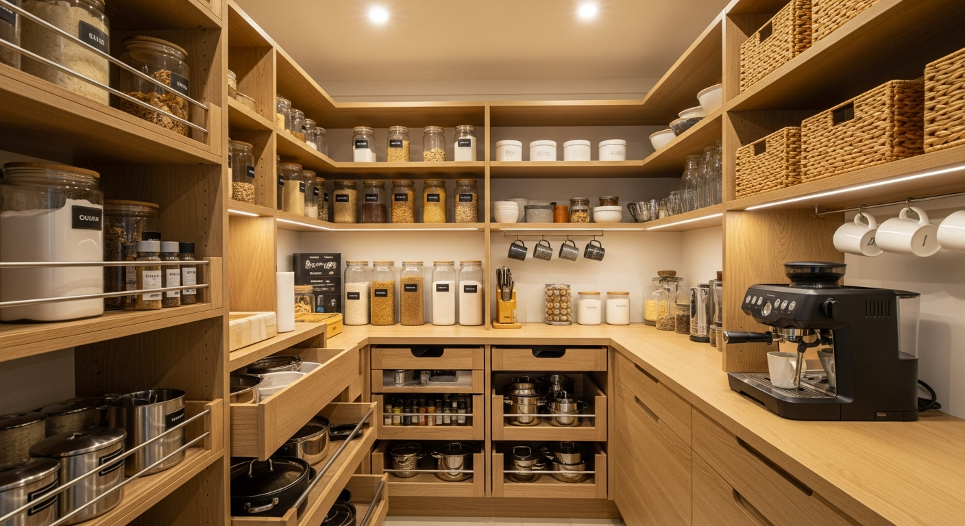 Η χρήση κάθετων αποθηκευτικών μονάδων, όπως συρταριέρες τροφίμων (larder units) ή στενά ντουλάπια για μπουκάλια και μπαχαρικά, είναι εξαιρετικά αποδοτική. Επίσης, η ενσωμάτωση ανασυρόμενων κάδων απορριμμάτων μέσα σε ένα ντουλάπι συμβάλλει στην καθαριότητα και την αισθητική του χώρου. Οι επιτοίχιες ράγες με γάντζους ή μαγνήτες είναι ιδανικές για κρέμασμα μαγειρικών σκευών ή μαχαιριών, απελευθερώνοντας χώρο στους πάγκους.