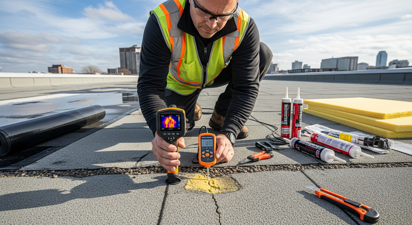 Η επιδιόρθωση των βλαβών της ταράτσας απαιτεί συστηματική προσέγγιση. Αρχικά, είναι σημαντικό να εντοπιστεί με ακρίβεια η πηγή του προβλήματος. Αυτό μπορεί να περιλαμβάνει λεπτομερή επιθεώρηση της επιφάνειας της ταράτσας, των υδρορροών, των σιφονιών και των σημείων σύνδεσης με κάθετες επιφάνειες, όπως καμινάδες ή τοιχία. Η χρήση θερμοκάμερας μπορεί να βοηθήσει στον εντοπισμό σημείων όπου υπάρχει απώλεια θερμότητας ή διείσδυση υγρασίας που δεν είναι ορατή με γυμνό μάτι.