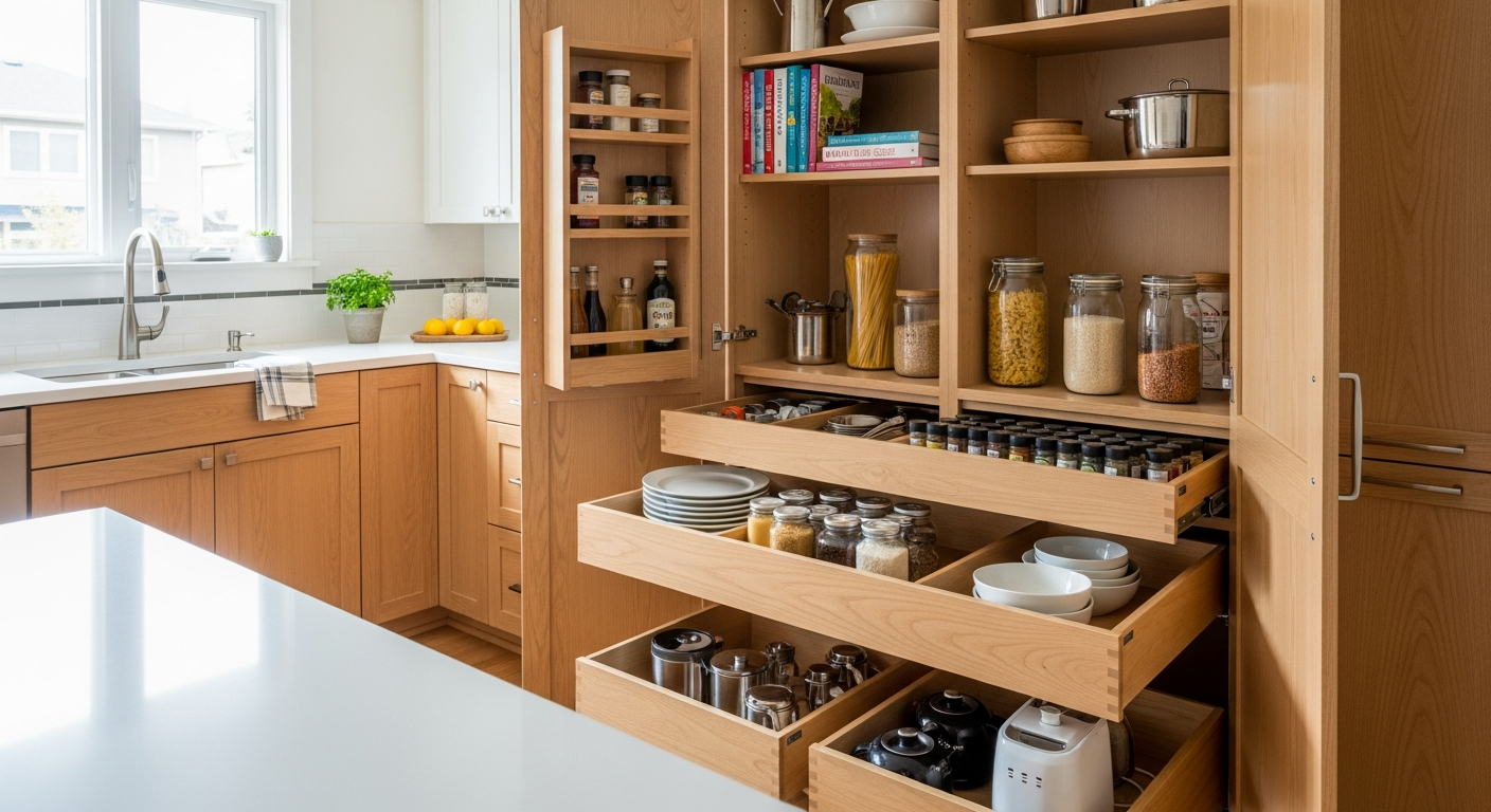 Η μεγιστοποίηση του χώρου στην κουζίνα απαιτεί έξυπνο σχεδιασμό και επιλογή κατάλληλων ντουλαπιών. Τα ντουλάπια που φτάνουν μέχρι το ταβάνι προσφέρουν επιπλέον αποθηκευτικό χώρο για αντικείμενα που δεν χρησιμοποιούνται καθημερινά, ενώ τα στενά, κάθετα ντουλάπια μπορούν να φιλοξενήσουν μπουκάλια, ταψιά ή καθαριστικά, εκμεταλλευόμενα κάθε κενό σημείο.
