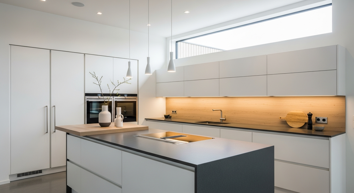 Ο φωτισμός είναι ένα κρίσιμο στοιχείο στη διαμόρφωση της ατμόσφαιρας και της λειτουργικότητας μιας μοντέρνας κουζίνας. Ένας ολοκληρωμένος σχεδιασμός φωτισμού περιλαμβάνει συνήθως τρία επίπεδα: γενικό φωτισμό, φωτισμό εργασίας και φωτισμό ανάδειξης. Ο γενικός φωτισμός, συχνά με ενσωματωμένα σποτ ή γραμμικά φωτιστικά, παρέχει επαρκή φωτεινότητα σε όλο τον χώρο. Ο φωτισμός εργασίας, όπως οι ταινίες LED κάτω από τα ντουλάπια, φωτίζει απευθείας τους πάγκους, διευκολύνοντας την προετοιμασία των γευμάτων.