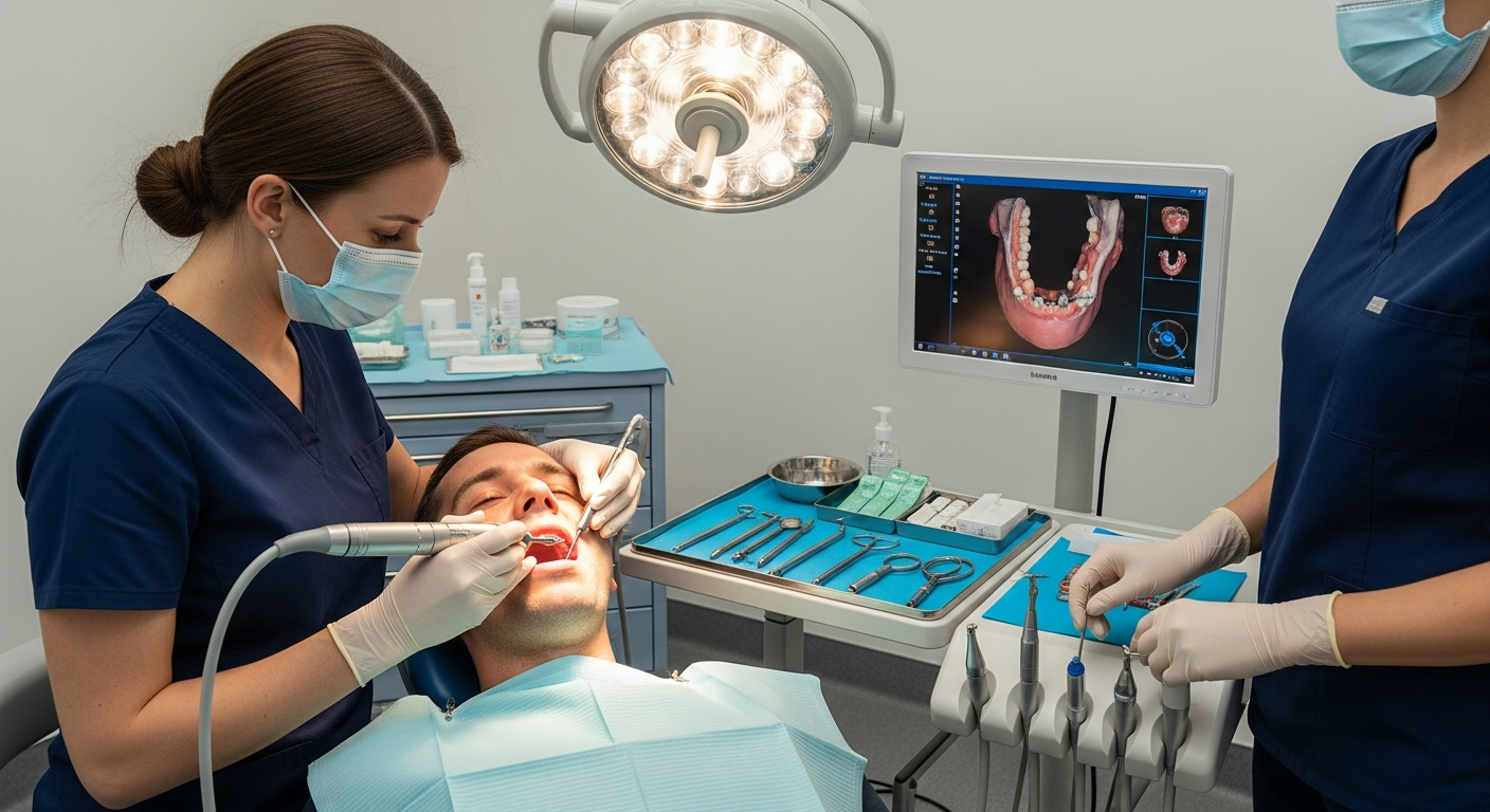 Η διαδικασία για την τοποθέτηση εμφυτευμάτων, ειδικά όταν εφαρμόζονται τεχνικές για ανώδυνη προσέγγιση, ξεκινά με μια λεπτομερή διαγνωστική εξέταση. Αυτή περιλαμβάνει ακτινογραφίες, μοντέλα γνάθων και συχνά μια CBCT σάρωση για την τρισδιάστατη απεικόνιση της οστικής δομής. Με βάση αυτά τα δεδομένα, ο οδοντίατρος μπορεί να σχεδιάσει με ακρίβεια τη θέση των εμφυτευμάτων, λαμβάνοντας υπόψη ανατομικές δομές και την ποιότητα του οστού. Σε περιπτώσεις χωρίς τομές, ο σχεδιασμός είναι ακόμη πιο κρίσιμος, καθώς απαιτείται η κατασκευή ενός εξατομικευμένου χειρουργικού νάρθηκα που καθοδηγεί την τοποθέτηση με ακρίβεια χιλιοστού. Κατά την επέμβαση, εφαρμόζεται τοπική αναισθησία για την πλήρη εξάλειψη του πόνου, και στη συνέχεια, με τη βοήθεια του νάρθηκα, το εμφύτευμα τοποθετείται στο οστό.
