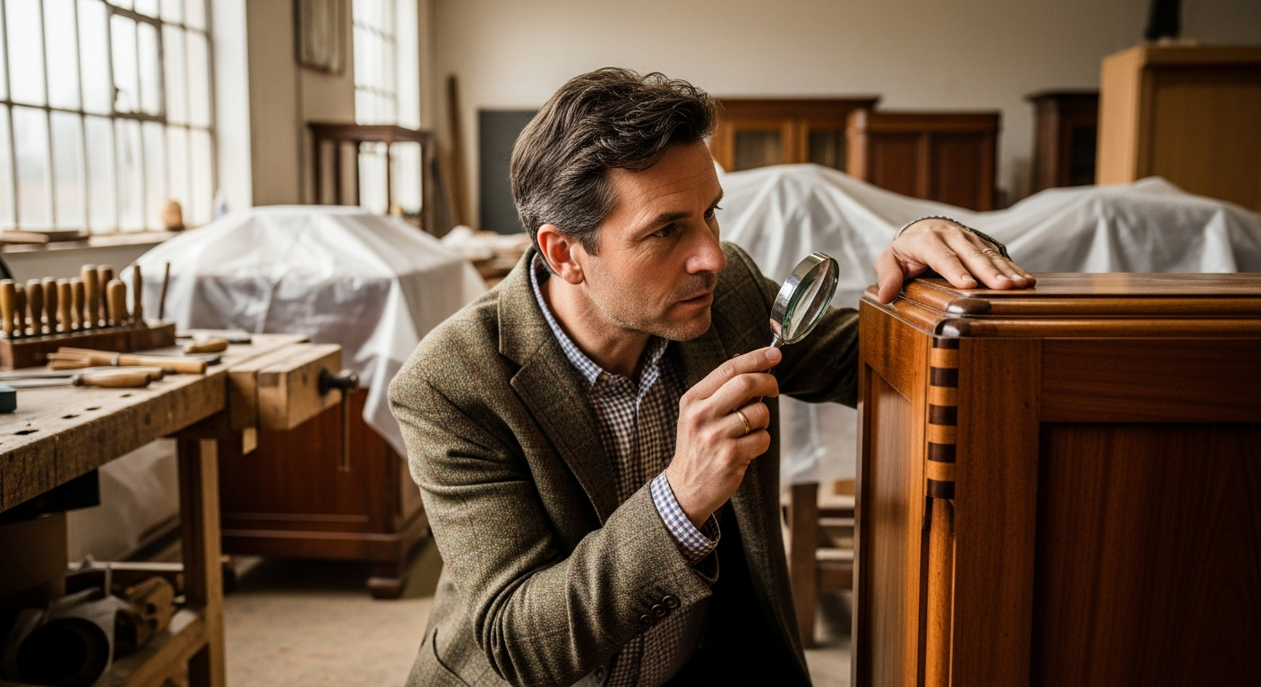 Η αναγνώριση της αυθεντικότητας είναι θεμελιώδης κατά την αγορά παλαιών επίπλων. Αυτό απαιτεί προσεκτική εξέταση της κατασκευής. Τα παλιά έπιπλα συχνά διαθέτουν παραδοσιακές τεχνικές συναρμολόγησης, όπως ξύλινα καρφιά (dovetails) ή ενώσεις με μόρσα και τενόνια (mortise and tenon joints), που διαφέρουν από τις σύγχρονες μεθόδους. Επίσης, τα υλικά και τα φινιρίσματα μπορούν να προσφέρουν ενδείξεις. Ένα αυθεντικό φινίρισμα, όπως το βερνίκι γομαλάκας, έχει διαφορετική υφή και όψη από τα σύγχρονα βερνίκια. Τα μεταλλικά στοιχεία, όπως οι λαβές και οι μεντεσέδες, πρέπει να είναι συμβατά με την εποχή του επίπλου και να φέρουν σημάδια παλαίωσης. Τυχόν σφραγίδες, ετικέτες ή υπογραφές από τον κατασκευαστή ή τον σχεδιαστή αποτελούν ισχυρές αποδείξεις αυθεντικότητας, αν και πρέπει να επαληθεύονται για την εγκυρότητά τους. Η προσεκτική παρατήρηση και η έρευνα είναι απαραίτητες για την επιβεβαίωση της αυθεντικότητας.