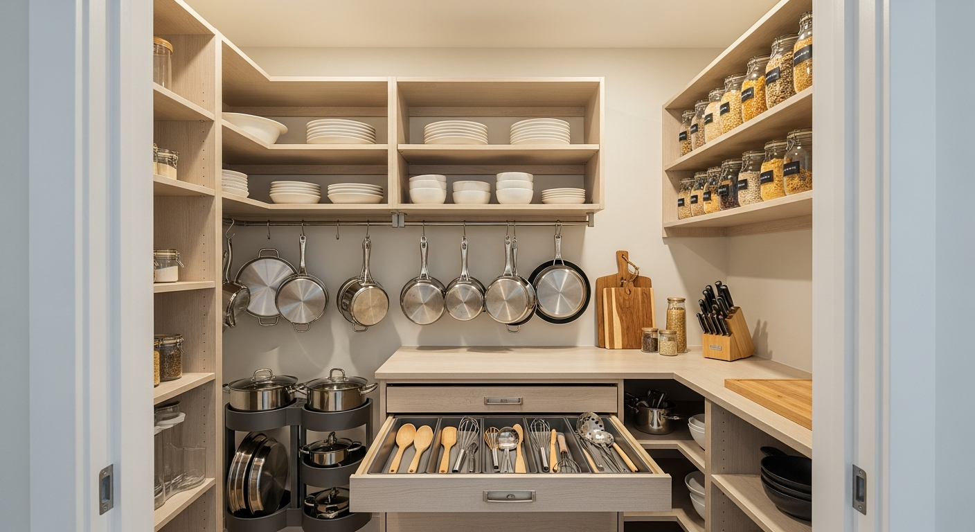 Les casseroles et les poêles, souvent encombrantes, peuvent être un défi à ranger. Des solutions compactes telles que des supports de couvercles, des tiroirs profonds avec des séparateurs ou des étagères coulissantes sont idéales. Les supports verticaux pour poêles permettent de les ranger sur le côté, économisant de l’espace et facilitant leur extraction. Les crochets de plafond ou les supports muraux sont également d’excellentes options pour suspendre ces articles, libérant ainsi les armoires inférieures.