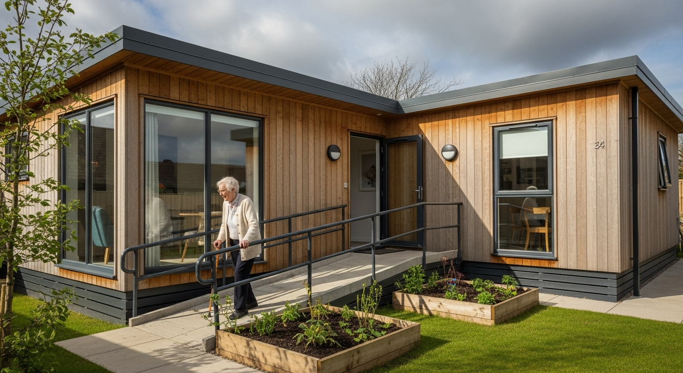 Un bungalow préfabriqué pour retraités est une habitation de plain-pied, construite en usine par modules, puis assemblée sur le site final. Ce type de logement est spécifiquement conçu en tenant compte des besoins des personnes âgées, intégrant des caractéristiques d’accessibilité dès la phase de conception. Cela inclut souvent des portes larges, des douches à l’italienne, des rampes d’accès, des prises électriques à hauteur ergonomique et l’absence de seuils pour faciliter les déplacements, y compris en fauteuil roulant. La construction modulaire permet une grande flexibilité dans l’aménagement intérieur et extérieur.