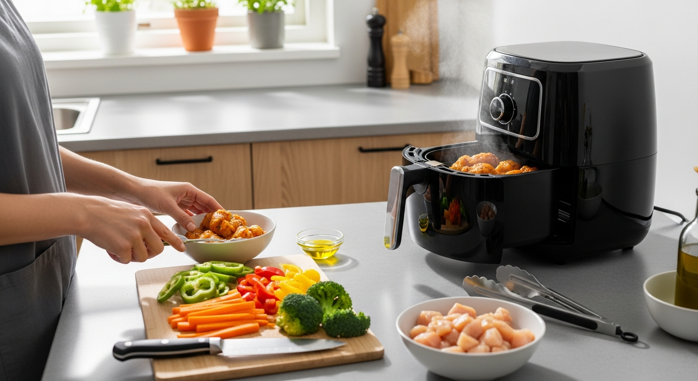 En airfryer er et kjøkkenapparat designet for å simulere dypsteking uten å bruke store mengder olje. Den fungerer ved å sirkulere varm luft rundt maten i et lukket kammer, noe som skaper en Maillard-reaksjon – prosessen som gir maten en sprø, brun overflate. Denne metoden er effektiv for ulike typer matlaging, fra grønnsaker til kjøtt, og gir ofte et resultat som ligner tradisjonell steking, men med betydelig mindre fett. Den varme luften sørger for jevn oppvarming og tekstur, noe som gjør den til et allsidig verktøy for ethvert moderne kjøkken.