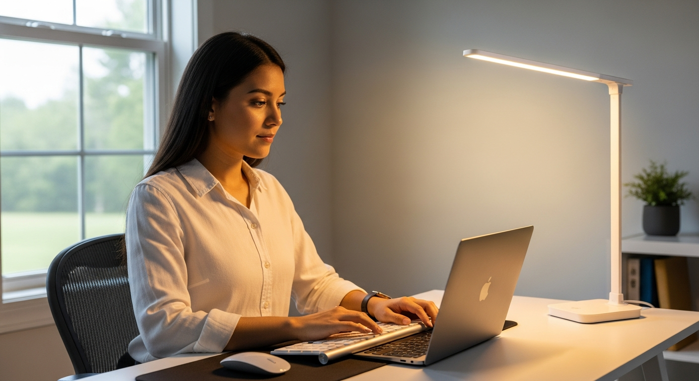 Odpowiednie oświetlenie to nie tylko kwestia jasności, ale także barwy, równomierności i braku olśnienia. Dobre oświetlenie minimalizuje cień, redukuje odblaski i zapewnia wystarczającą ilość światła do wykonywania zadań bez nadmiernego wysiłku wzrokowego. W kontekście pracy biurowej, nauki czy czytania, kluczowe jest unikanie kontrastów między jasnym ekranem a ciemnym otoczeniem, co może prowadzić do szybkiego zmęczenia oczu. Wybór opraw (Fixtures) o odpowiednim rozpraszaniu światła i możliwości regulacji jasności (Brightness) jest istotny dla stworzenia optymalnych warunków.