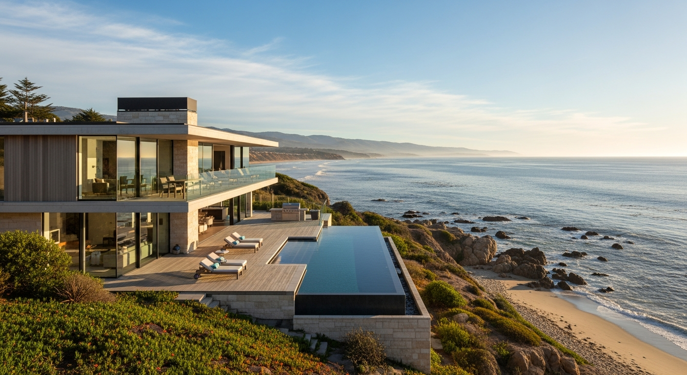 A arquitetura de residências à beira-mar é projetada para maximizar a experiência do ambiente costeiro. O design frequentemente incorpora grandes janelas e portas de vidro, varandas espaçosas e terraços que oferecem vistas panorâmicas para o oceano e permitem a entrada abundante de luz natural. Materiais como madeira tratada, concreto aparente, vidro e metais resistentes à corrosão são comumente utilizados para suportar as condições climáticas específicas da costa. A integração da casa com a paisagem circundante é uma prioridade, buscando uma harmonia entre o construído e o natural.