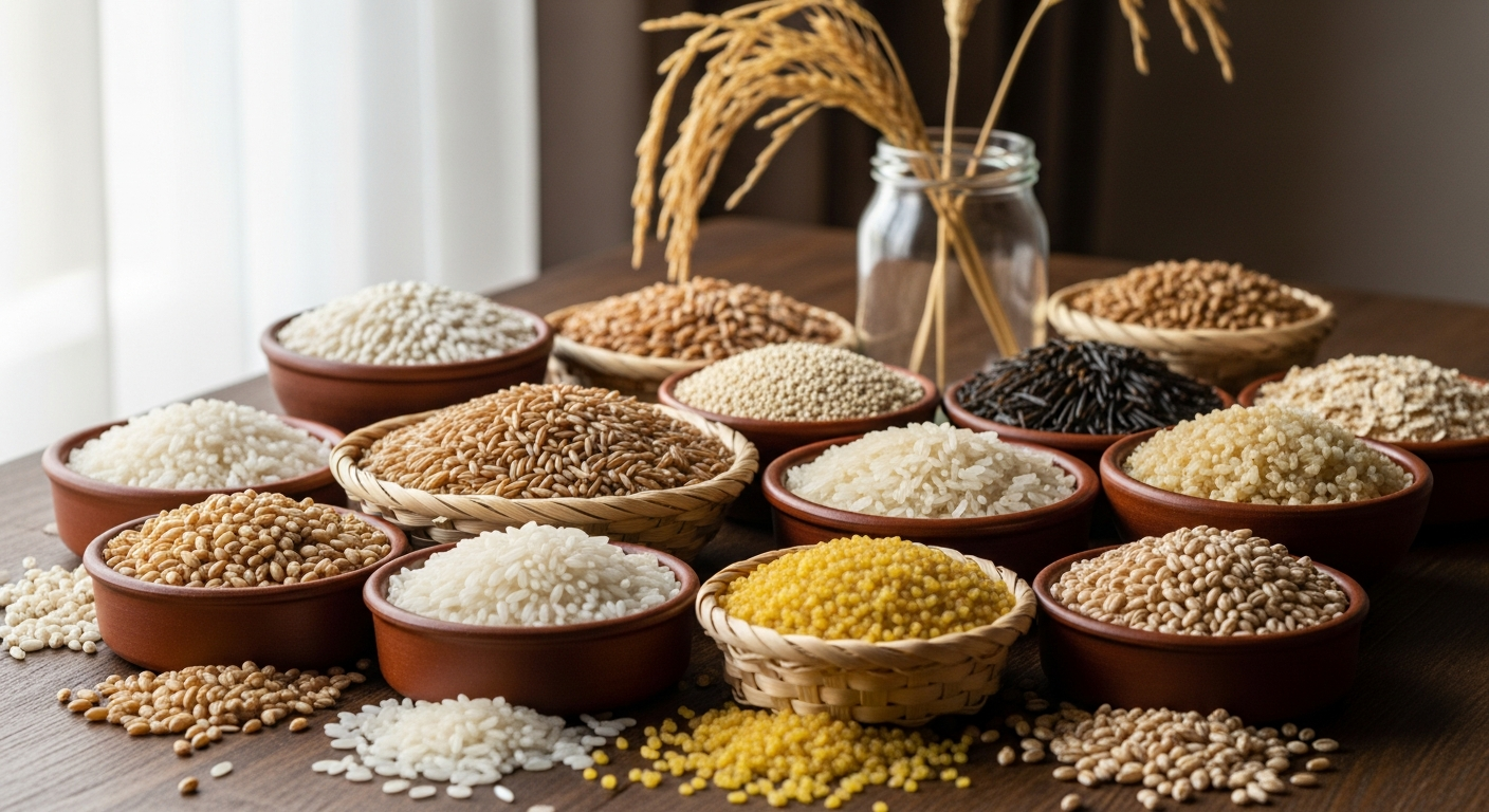 Variedades de grãos brancos e integrais na culinária