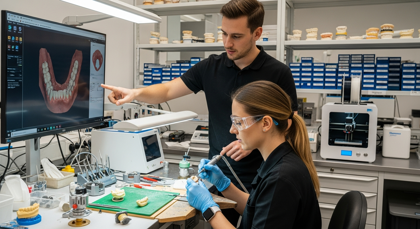 Den dentala industrin har genomgått en betydande teknologisk utveckling, där digitalisering spelar en allt större roll. Moderna dentallaboratorier använder avancerad teknik som CAD/CAM (Computer-Aided Design/Computer-Aided Manufacturing) för att designa och framställa dentala produkter med hög precision. Detta innebär att tekniker arbetar med 3D-skanning, digital modellering och fräsmaskiner eller 3D-skrivare. Användningen av nya material, som zirkonia och olika kompositer, ställer också höga krav på teknikerns kunskap och färdigheter i att hantera dessa material för att skapa funktionella och estetiskt tilltalande restaurationer och anordningar.