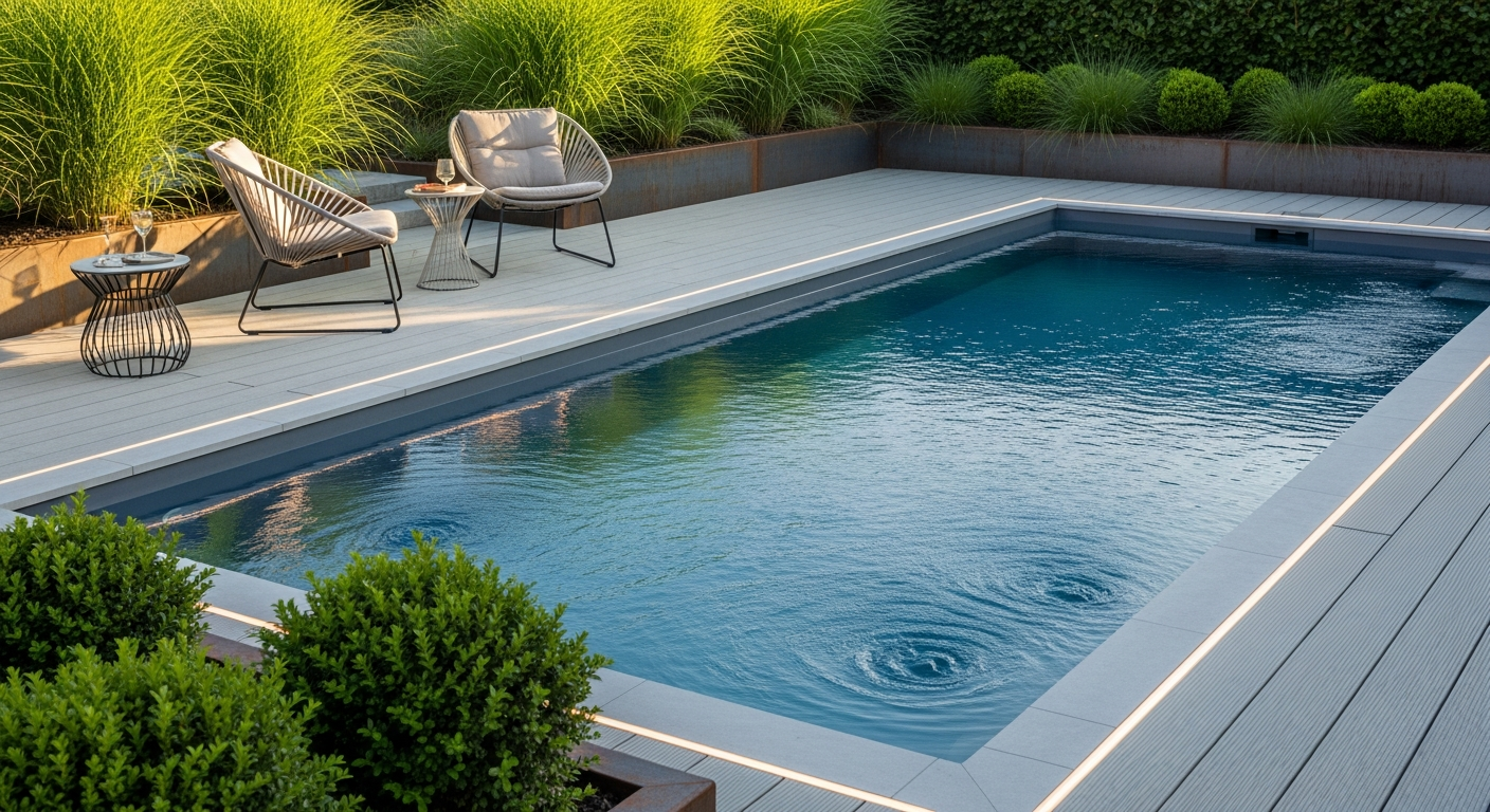 Декор навколо басейну важливий не менше, ніж сама чаша. Вибір покриття – дерев’яні терасні дошки, камінь, композитні матеріали – впливає на стиль, довговічність і комфорт при ходьбі босоніж. Рослини повинні бути підібрані так, щоб мінімізувати потрапляння листя й пилку у воду; краще віддавати перевагу видам з глибокою кореневою системою та невеликою сезонною листопадністю.